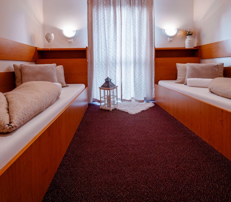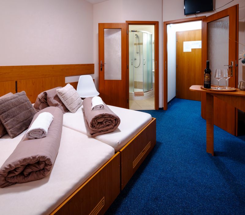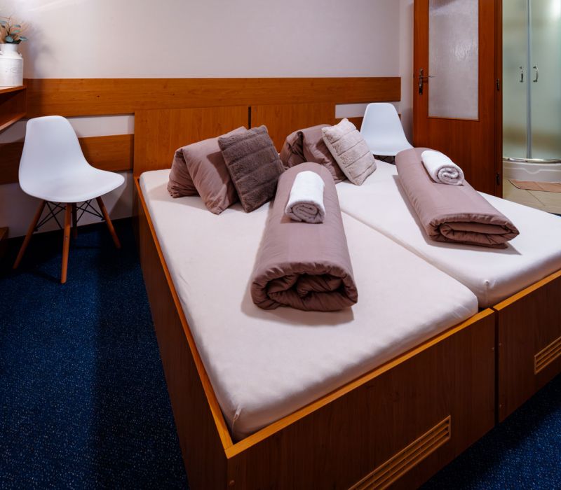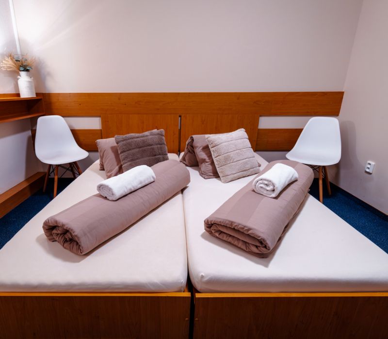 19x dvoulůžkový pokoj Standard s vlastním sociálním zařízením, 15 m², oddělené postele s možností úpravy na manželské
